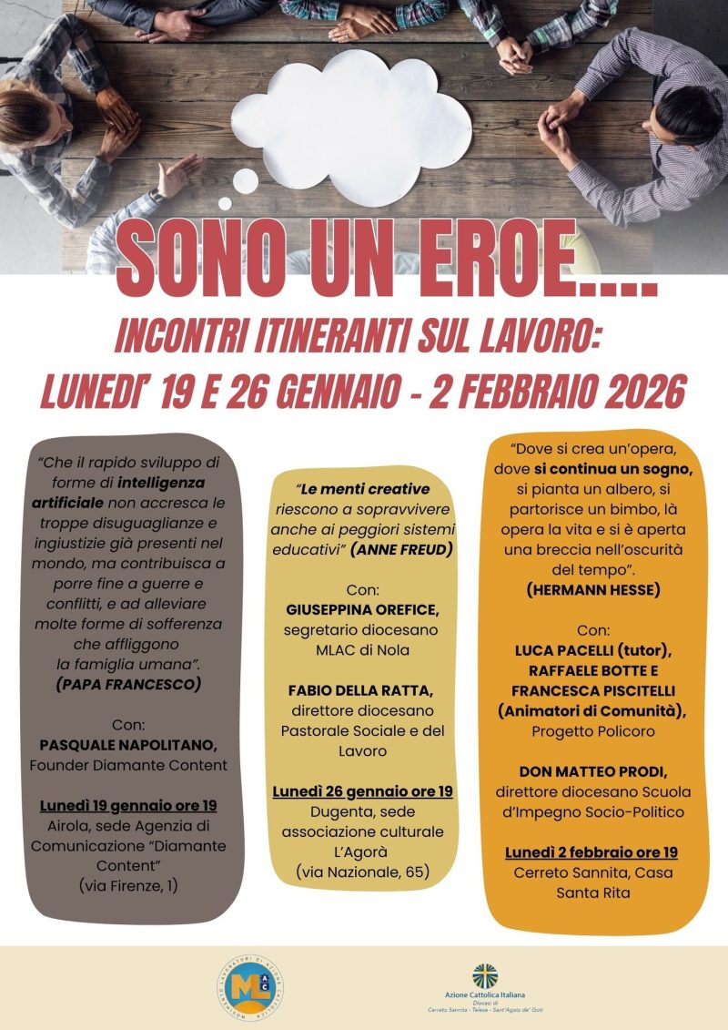 Tre incontri itineranti formativi, nei prossimi lunedì di gennaio, sul tema del lavoro sono promossi dal Movimento Lavoratori di Azione Cattolica della Diocesi di Cerreto Sannita-Telese-Sant’Agata de’ Goti. Si parte da una base indiscutibile: siamo tutti un po’ eroi sul piano lavorativo. Quelli che fanno turni massacranti per portare avanti la propria vita personale e la condizione economica familiare, quelli sottopagati che lottano per essere retribuiti in maniera dignitosa, quelli che cercano lavoro, quelli che restano, quelli che o scelgono di andar via per inseguire un sogno ed altre esperienze o che si vedono costretti a doverlo fare, quelli che provano ad investire sul territorio, quelli che osano scoprire nuove strade, escogitare nuove idee, creare nuovi servizi. E proprio su questo primo filone dell’autoimprenditorialità, della progettazione sociale, dei talenti da valorizzare, della creatività da far “esplodere” e da mettere in circolo sarà incentrato il primo incontro di lunedì 19 gennaio alle ore 19, che avrà luogo ad Airola (BN) presso la sede dell’agenzia di comunicazione “Diamante Content”. Papa Francesco, nei suoi interventi degli ultimi anni, ha più volte auspicato che l’IA non accresca le disuguaglianze e ingiustizie sociali (purtroppo già presenti), “ma contribuisca a porre fine a guerre e conflitti, e ad alleviare molte forme di sofferenza che affliggono la famiglia umana”. Interverrà per un momento formativo ed esperienziale il Founder dell’Agenzia di Comunicazione “Diamante” Pasquale Napolitano. Gli altri due incontri si svolgeranno, rispettivamente, a Dugenta e a Cerreto Sannita e vedranno come argomenti l’autoimprenditorialità, i talenti e la progettazione sociale e le prospettive future di speranza nelle nostre aree interne.