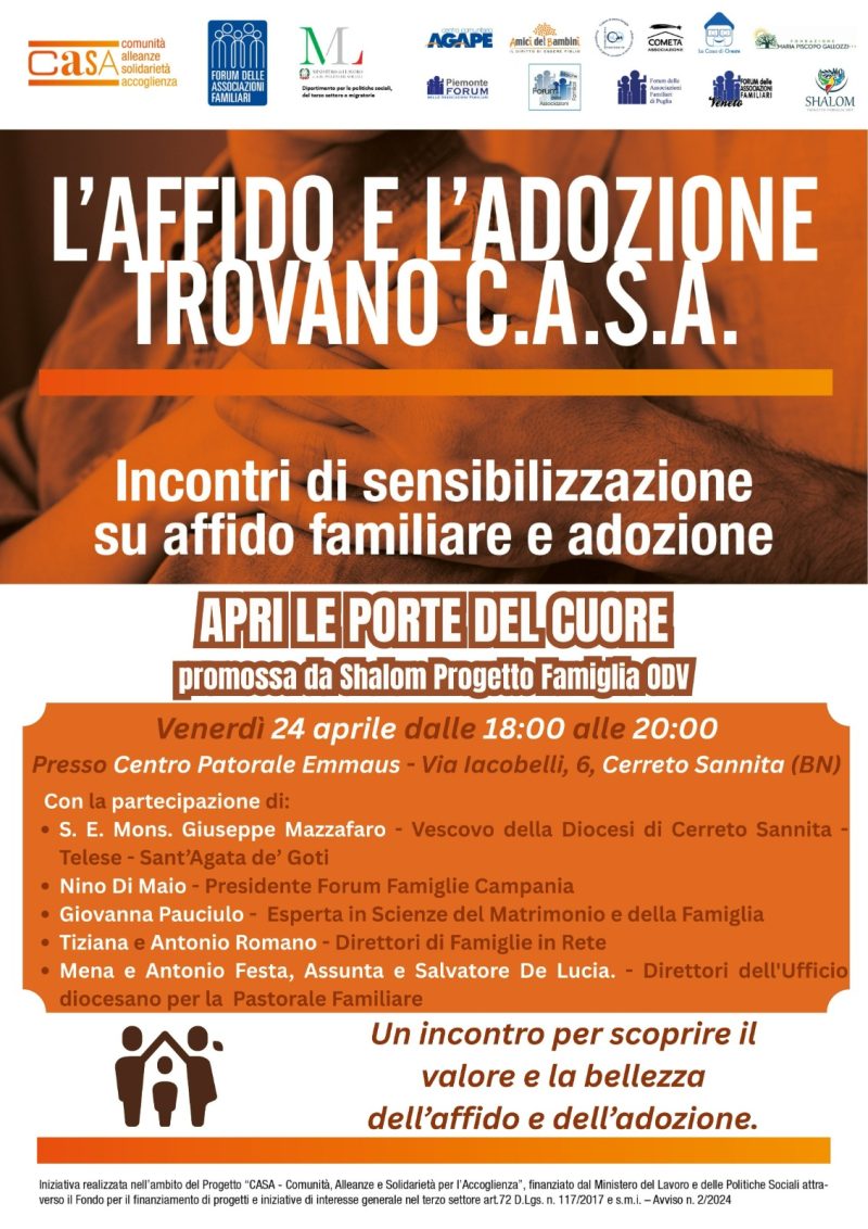 L’Ufficio Famiglia diocesano, unitamente alla nascente associazione Famiglie in Rete, ha organizzato un incontro formativo a livello diocesano sulle adozioni e sugli affidi con i Responsabili del Forum delle famiglie campane, per venerdì 24 aprile 2026.