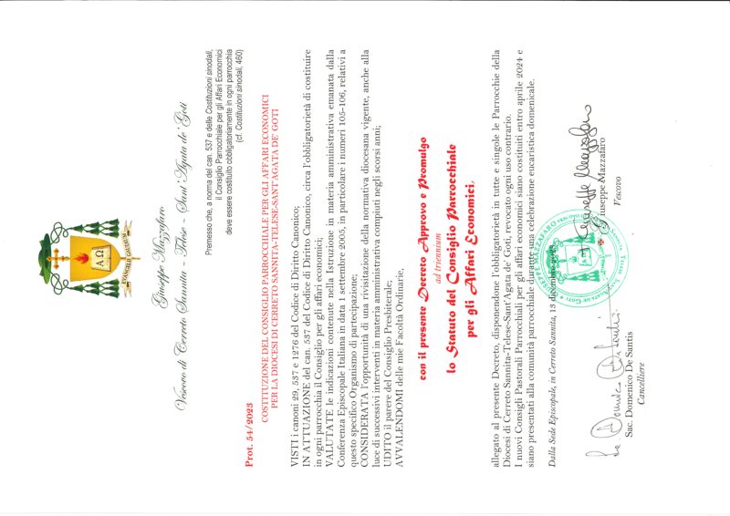Decreto di approvazione e promulgazione dello Statuto e Regolamento del Consiglio Parrocchiale per gli Affari Economici