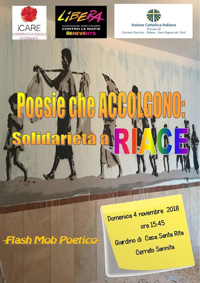La cooperativa sociale di comunità iCare, l’Azione Cattolica diocesana e il nascente Presidio interterritoriale di Libera per la Valle Caudina e per la Valle Telesina hanno aderito al flash mob poetico di solidarietà a Riace “Poesie che accolgono” e lo lanciano sul nostro territorio per questa domenica 4 novembre ore 15:45 presso Casa Santa Rita a Cerreto Sannita. E’ un’iniziativa, dalla durata di 10/15 minuti, che nasce dall’incontro tra persone appassionate di poesia che credono nella solidarietà, accoglienza e inclusione sociale delle persone più fragili.