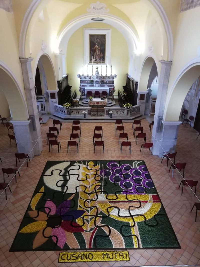 La tipica e famosa Infiorata di Cusano Mutri non c’è stata nel tradizionale abbellire e decorare strade, piazze e chiese della cittadina, fin dall’alba della domenica mattina, con colori e tanta creatività. Ma l’Unità Pastorale delle tre parrocchie, moderata da don Domenico Ruggiano, insieme alla locale Pro Loco hanno deciso di non trascurare e lasciare completamente inosservato questo momento, molto sentito non solo dai cusanesi ma dai tantissimi visitatori che, ogni anno, accorrono a Cusano Mutri durante questa solennità. E, così, oltre ad impegnare bambini e ragazzi della comunità con l’albero dell’Infiorata, parrocchie e Pro Loco hanno escogitato un’infiorata-puzzle, un unico tappeto floreale (intitolato “Un solo Corpus” perché è stato eseguito lo stesso disegno da tutti gli infioratori Italiani e stranieri appartenenti ad InfiorItalia, l’Associazione Nazionale Infiorate Artistiche) nella chiesa parrocchiale di San Giovanni Battista, raffiguranti il corpo e il sangue di Cristo. Un quadro floreale che mostrava una finestra sull’Assoluto, Gesù Cristo, frutto di un’esperienza di preghiera. Infatti, prima di questo lavoro, c’è stato un momento di preghiera con adorazione eucaristica, dedicato soprattutto ai maestri infioratori, le cui mani sono state benedette proprio dal parroco con l’ostensorio, come segno di illuminazione per il disegno che andava ad essere creato proprio da quelle mani. Un momento di intensa e forte spiritualità da coltivare, che richiama proprio al mistero dell’amore eterno di Dio per l’uomo, rivelato nel banchetto eucaristico dell’ultima cena. “Il quadro-puzzle – ha esordito don Domenico Ruggiano nell’omelia – indica la diversità di chi ci ha lavorato, ma dice l’unità del quadro. Dice, cioè, che siamo tutti nella stessa barca, come ci ricordava papa Francesco. E chi lo guarda dalla prospettiva dell’alto vede la bellezza di questo quadro nella sua interezza e non il singolo pezzo. Più siamo in grado di elevarci verso questa prospettiva dell’alto più saremo in grado di avere un quadro di unità per camminare insieme”. Una tradizione importantissima per la fede popolare della comunità di Cusano Mutri, che naturalmente non può fermarsi alla ricorrenza del Corpus Domini. “Possa sempre più la nostra comunità – prosegue il parroco-moderatore don Domenico – crescere nel senso di appartenenza al tessuto sociale e religioso; nessuno si senta escluso o messo da parte. Le porte della Chiesa rimangono aperte ad ognuno. Sentitevi liberi sempre di venire, avanzare proposte, condividere tempo e disponibilità. Ricordiamoci sempre e tutti che l’unico “padrone” di casa è Cristo e i responsabili sono i parroci. Mi raccomando di sostenerci gli uni gli altri soprattutto con la preghiera vicendevole, nella consapevolezza che ci sono tanti bisogni e bisognosi. Quest’’infiorata-puzzle ci ha insegnato che tutto è importante, anche il “nero” della posa di caffè”.