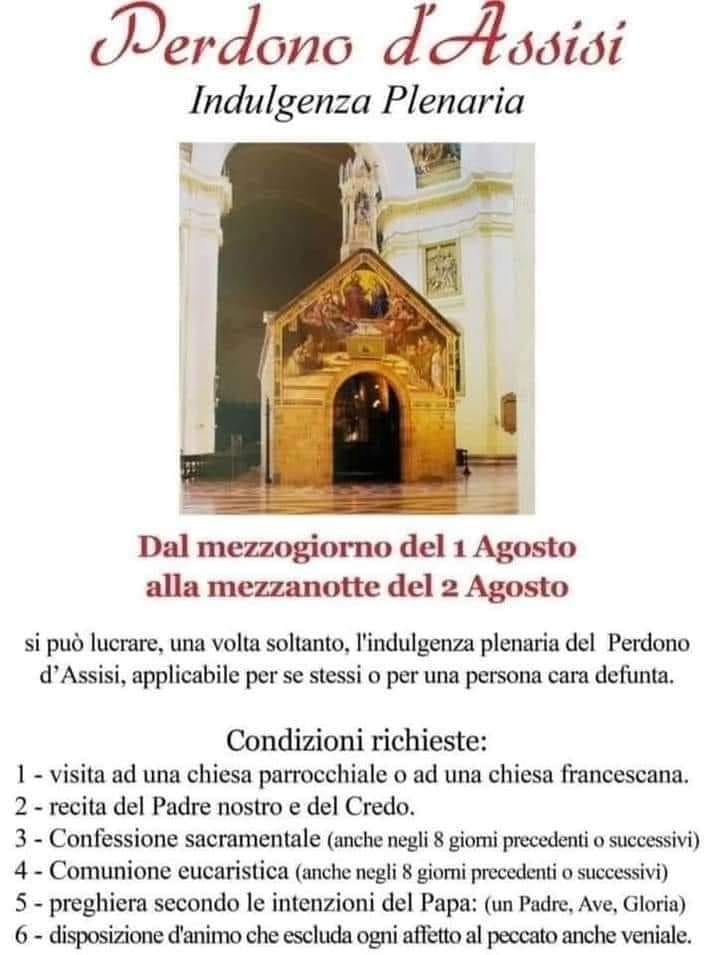 In evidenza, News 1 Agosto 2022 Il Perdono d’Assisi è un’indulgenza plenaria FacebookTwitterLinkedinPrintemailIl Perdono d’Assisi è un’indulgenza plenaria che, nella Chiesa cattolica, può essere ottenuta dai propri fedeli dal mezzogiorno del 1º agosto alla mezzanotte del 2 agosto di ogni anno.