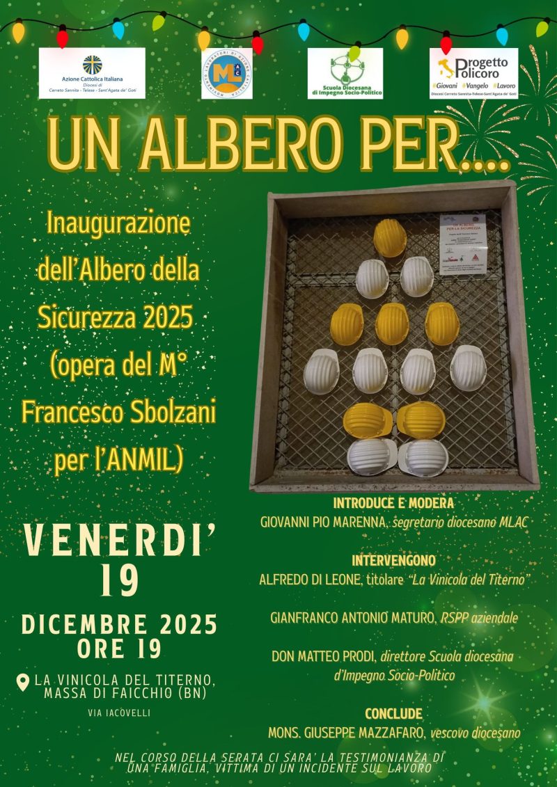 Quella delle morti e degli incidenti sul lavoro è una vera e propria drammatica piaga che, di anno in anno, non accenna a placarsi. Solo in Campania, nei primi 10 mesi di quest’anno, ci sono stati 62 morti: 62 volti e storie, 62 famiglie distrutte e lacerate. Per questo, nella Diocesi di Cerreto Sannita-Telese-Sant’Agata de’ Goti, il Movimento Lavoratori di Azione Cattolica diocesano, il Progetto Policoro (Caritas-Pastorale Sociale e del Lavoro e Pastorale Giovanile) e la Scuola diocesana d’Impegno Socio-Politico, aderiscono per il secondo anno consecutivo all’iniziativa del MLAC nazionale “L’Albero della Sicurezza”, opera ideata dal M° Francesco Sbolzani per la Fondazione “Sosteniamoli subito” dell’ANMIL. L’Albero verrà inaugurato domani, venerdì 19 dicembre alle ore 19 a Massa di Faicchio (BN), presso La Vinicola del Titerno (in via Iacovelli). Nel corso della serata, impreziosirà ulteriormente l’iniziativa di sensibilizzazione sulla sicurezza sul lavoro, una visita guidata nell’azienda vitivinicola e l’ascolto della testimonianza di una famiglia, vittima di un incidente sul lavoro. Interverranno il titolare de La Vinicola del Titerno Alfredo Di Leone, il Responsabile del Servizio di Prevenzione e Protezione aziendale Gianfranco Antonio Maturo e il direttore Scuola diocesana d’Impegno Socio-Politico don Matteo e Prodi. Le conclusioni e la benedizione dell’opera saranno affidate al vescovo diocesano mons. Giuseppe Mazzafaro. L’opera, interamente realizzata con caschetti da lavoro dalle aziende “La Vinicola del Titerno” e “Edilizia Di Leone” di San Lorenzello (BN) è un simbolo forte che ci ricorda, ogni giorno, che è un valore vitale da non mettere mai in secondo piano.