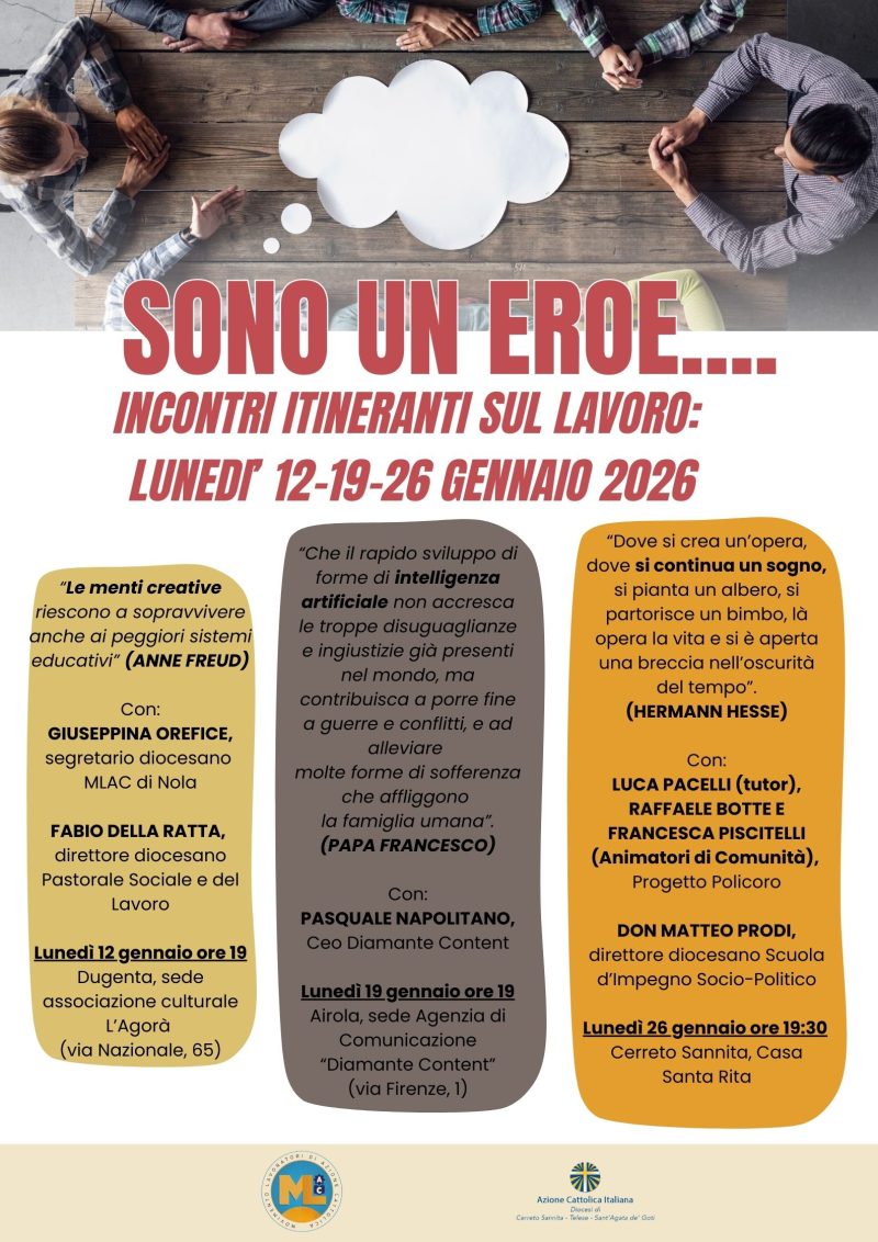 Tre incontri itineranti formativi, nei prossimi lunedì di gennaio, sul tema del lavoro sono promossi dal Movimento Lavoratori di Azione Cattolica della Diocesi di Cerreto Sannita-Telese-Sant’Agata de’ Goti. Si parte da una base indiscutibile: siamo tutti un po’ eroi sul piano lavorativo. Quelli che fanno turni massacranti per portare avanti la propria vita personale e la condizione economica familiare, quelli sottopagati che lottano per essere retribuiti in maniera dignitosa, quelli che cercano lavoro, quelli che restano, quelli che o scelgono di andar via per inseguire un sogno ed altre esperienze o che si vedono costretti a doverlo fare, quelli che provano ad investire sul territorio, quelli che osano scoprire nuove strade, escogitare nuove idee, creare nuovi servizi. E proprio su questo primo filone dell’autoimprenditorialità, della progettazione sociale, dei talenti da valorizzare, della creatività da far “esplodere” e da mettere in circolo sarà incentrato il primo incontro di lunedì 12 gennaio alle ore 19, che avrà luogo a Dugenta (BN) presso la sede dell’associazione culturale “L’Agorà” (via Nazionale, 65). D’altra parte, diceva la psicoanalista Anne Freud, che sono proprio le menti creative che “riescono a sopravvivere anche ai peggiori sistemi educativi”. Interverranno per questo momento formativo ed esperienziale il segretario del MLAC della Diocesi di Nola Giuseppina Orefice e il direttore diocesano della Pastorale Sociale e del Lavoro Fabio Della Ratta. Gli altri due incontri si svolgeranno, rispettivamente, ad Airola e a Cerreto Sannita e vedranno come argomento le opportunità e i rischi legati all’intelligenza artificiale e le prospettive future di speranza nelle nostre aree interne.