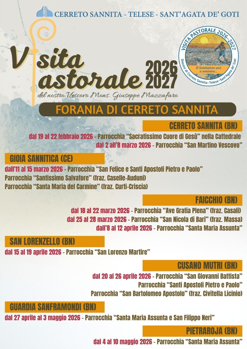 La Forania di Cerreto Sannita si prepara ad accogliere la Visita Pastorale, un momento significativo per le comunità parrocchiali del territorio, occasione di incontro diretto tra il Pastore e le comunità parrocchiali e con i fedeli, di verifica del cammino ecclesiale e di rinnovamento spirituale nel segno della comunione e della corresponsabilità ecclesiale. . Il programma coinvolgerà numerosi comuni tra le province di Benevento e Caserta, toccando parrocchie e realtà locali in un itinerario che si snoderà da febbraio a maggio.