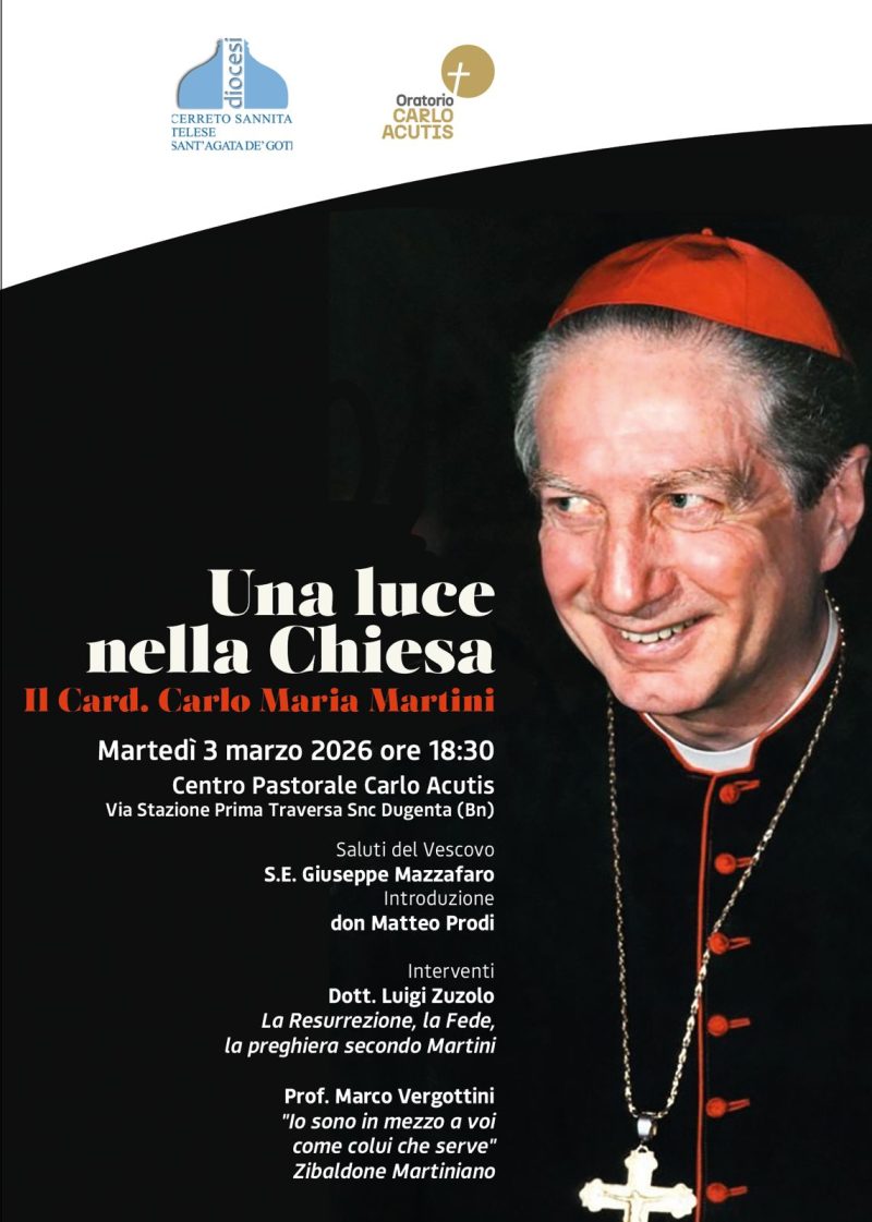 Martedì 3 marzo 2026, alle ore 18:30, il Centro Pastorale Carlo Acutis di Dugenta ospiterà un incontro dal titolo “Una luce nella Chiesa”, dedicato alla figura del Cardinale Carlo Maria Martini, tra le personalità più significative del panorama ecclesiale contemporaneo. L’iniziativa è promossa nell’ambito delle attività ecclesiali del territorio diocesano di Cerreto Sannita-Telese-Sant’Agata de’ Goti, in collaborazione con l’Oratorio Carlo Acutis.
